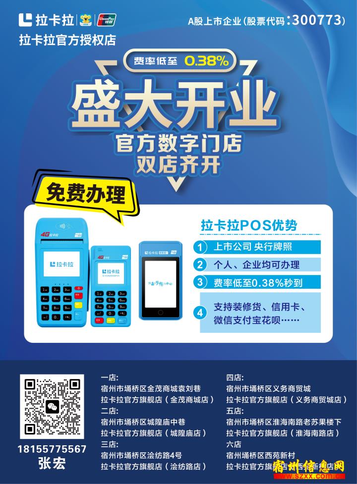 上市公司拉卡拉pos机 官方授权营业厅 宿州淮海南路店宿州淮(老苏果向南5(老苏0米,恒丰大厦0米,1楼门朝西门面1楼门) 免费办理 扫码费率0.38% 刷卡国家规定0.6% 永不调价 官方授权,售后无忧 欢迎各位同行来店喝茶 联系电话:张经联系电理181557理1875567