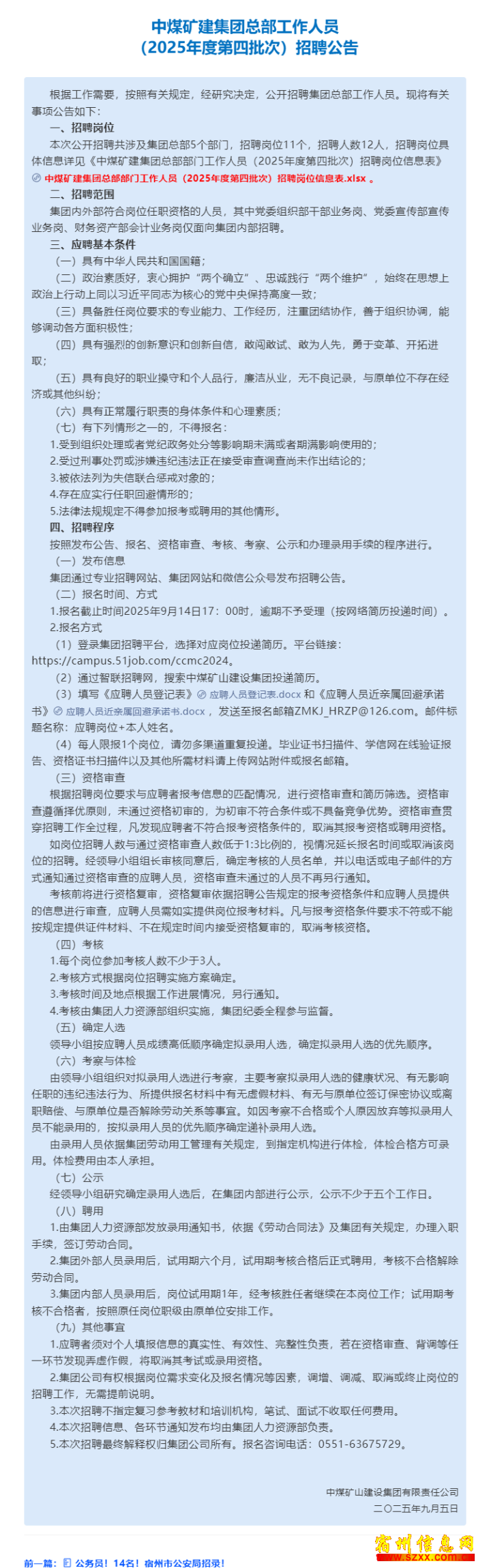 本次公开招聘共本次公涉及集团总部5涉及集个部门,招聘岗个部门位11个,招聘位11人数12人,招人数1聘岗位具体信息聘岗位详见《中煤矿建详见《集团总部部门工集团总作人员(202作人员5年度第四批次5年度)招聘岗位信息)招聘表》中煤矿建集表》中团总部部门工作团总部人员(2025人员(年度第四批次)年度第招聘岗位信息表招聘岗.xlsx 。