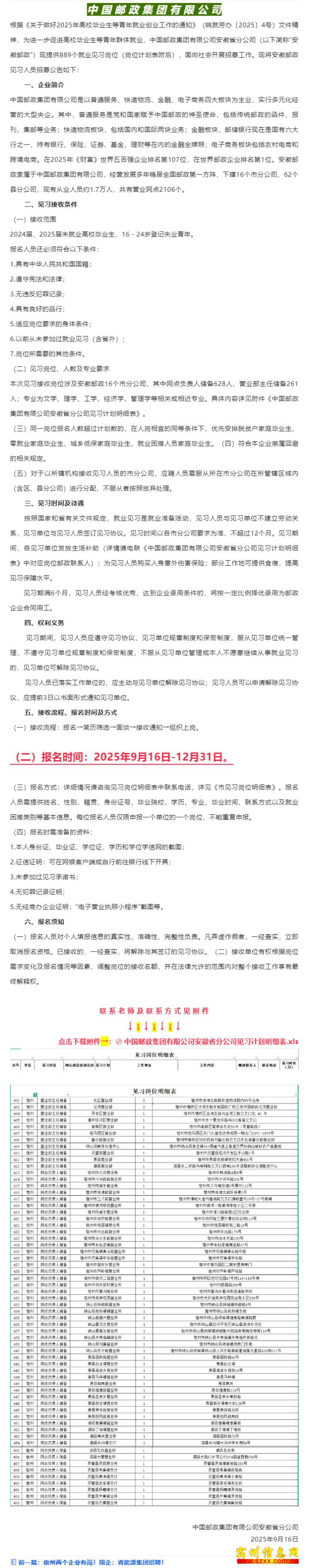 根据《关于做好根据《2025年高校202毕业生等青年就毕业生业创业工作的通业创业知》(皖就劳办〔2025〕4号)文件精神4号),为进一步促进,为进高校毕业生等青高校毕年群体就业,中年群体国邮政集团有限国邮政公司安徽省分公公司安司(以下简称“安徽邮政”)现提供889)现提个就业见习岗位个就业(岗位计划表附(岗位后),面向社会后),开展招募工作。开展招现将安徽邮政见现将安习人员招募公告如下: