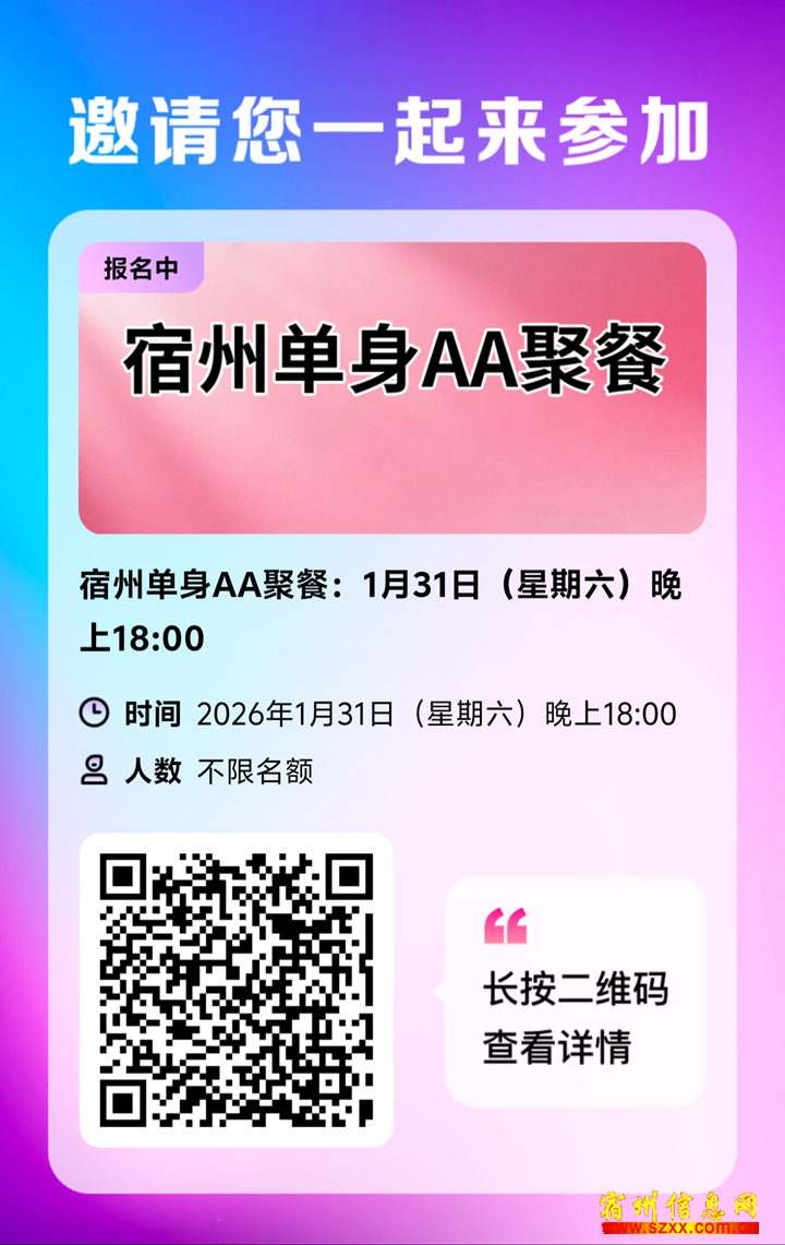 宿州单身AA聚宿州单餐:1月31日餐:1(星期六)晚上18:00