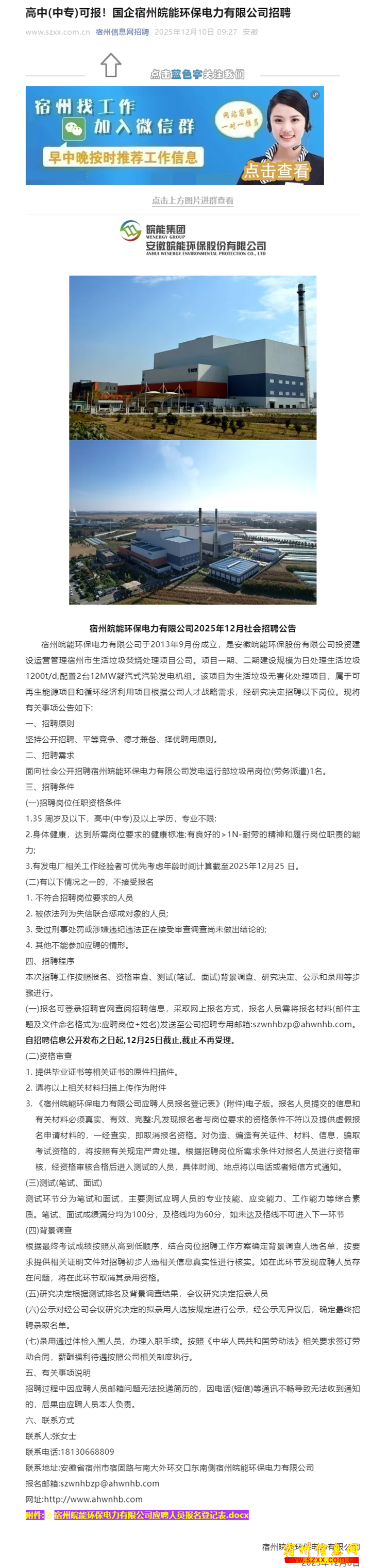 高中(中专)可报!国企宿州皖能环保电力有限公司招聘