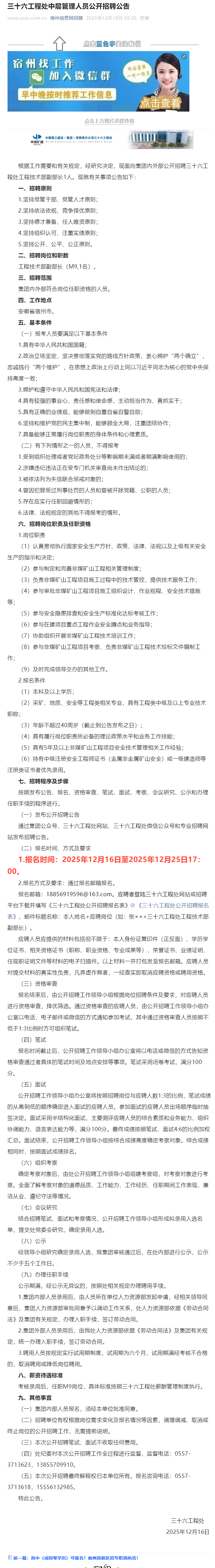 中煤三建三十六工程处中层管理人员公开招聘公告