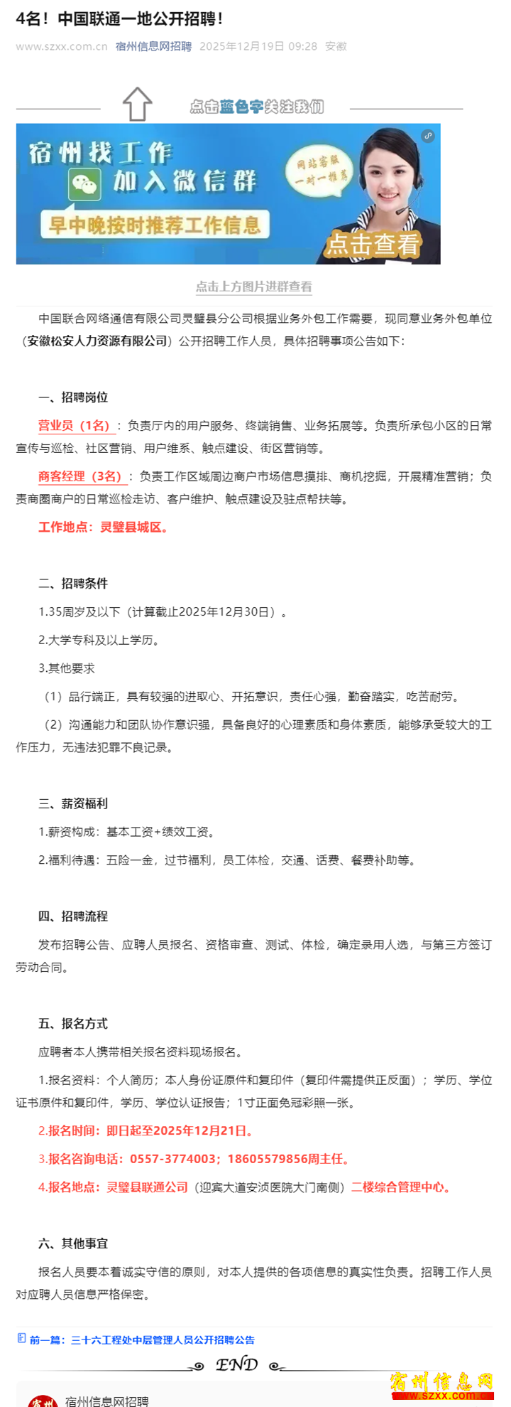 4名!中国联通一地公开招聘!