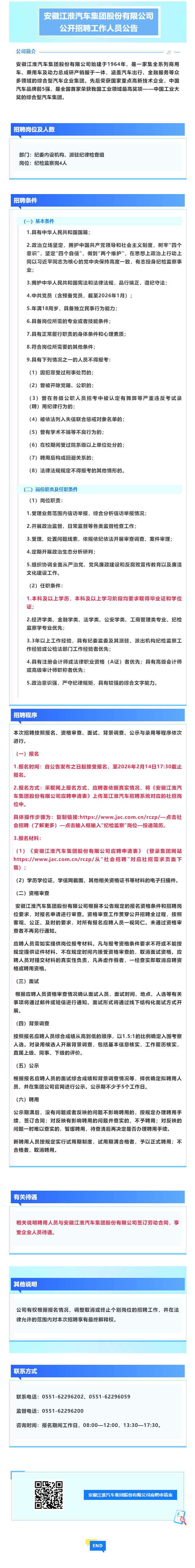 招聘4人,国企,安徽江淮汽车集团招聘公告~