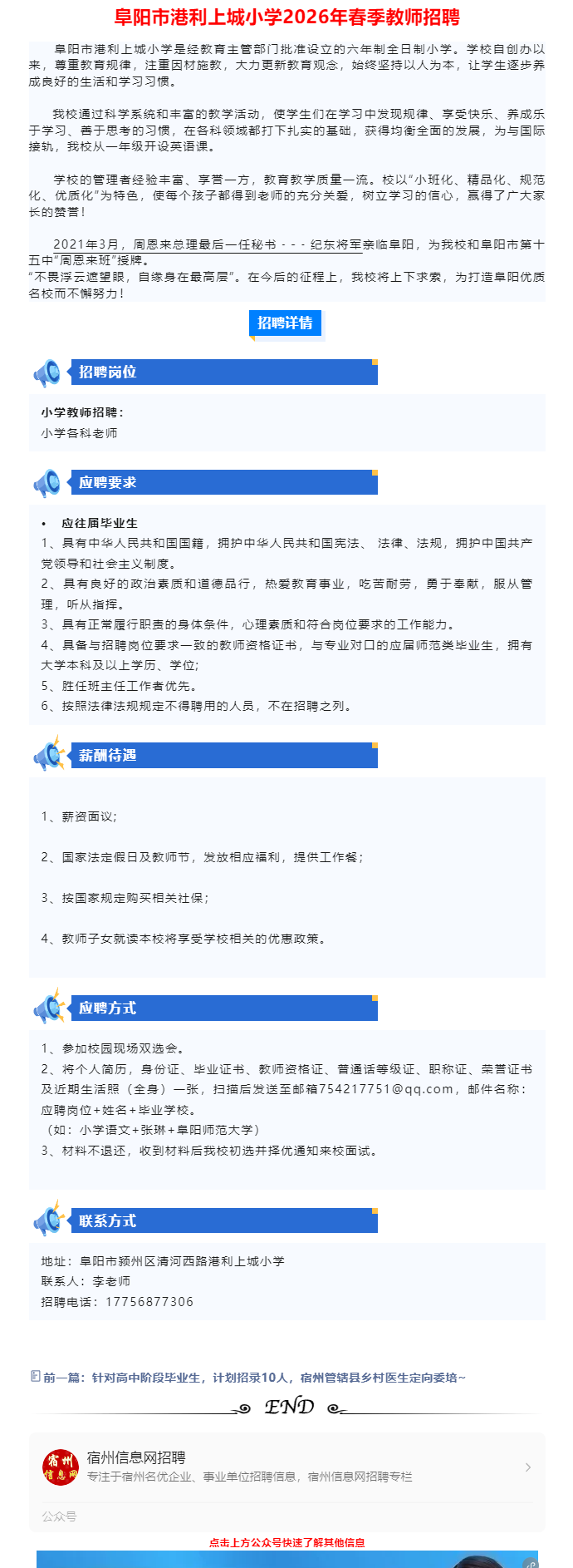 各个学科,安徽阜阳港利小学教师招聘公告~