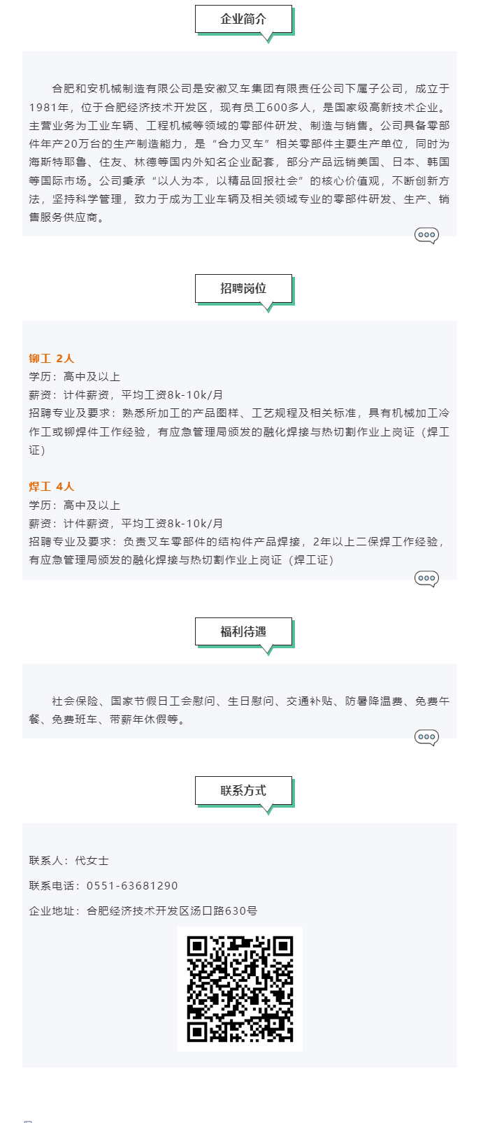 招聘专业及要求:负责叉车零部件的结构件产品焊接,2年以上二保焊工作经验,有应急管理局颁发的融化焊接与热切割作业上岗证(焊工证)