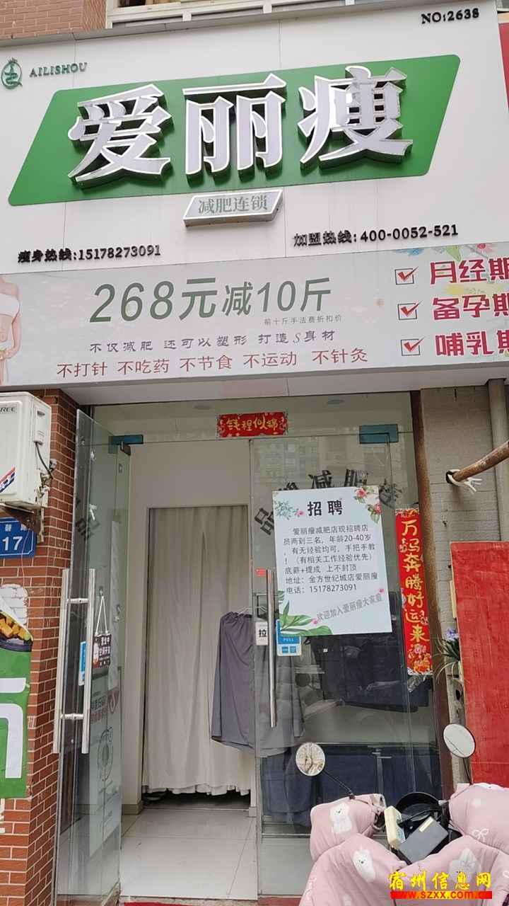 店里主要就是做减肥和美容的,需要销售产品,爱丽瘦是全国连锁店,有十年经验 单位地址:埇桥区大观园上林苑4栋106